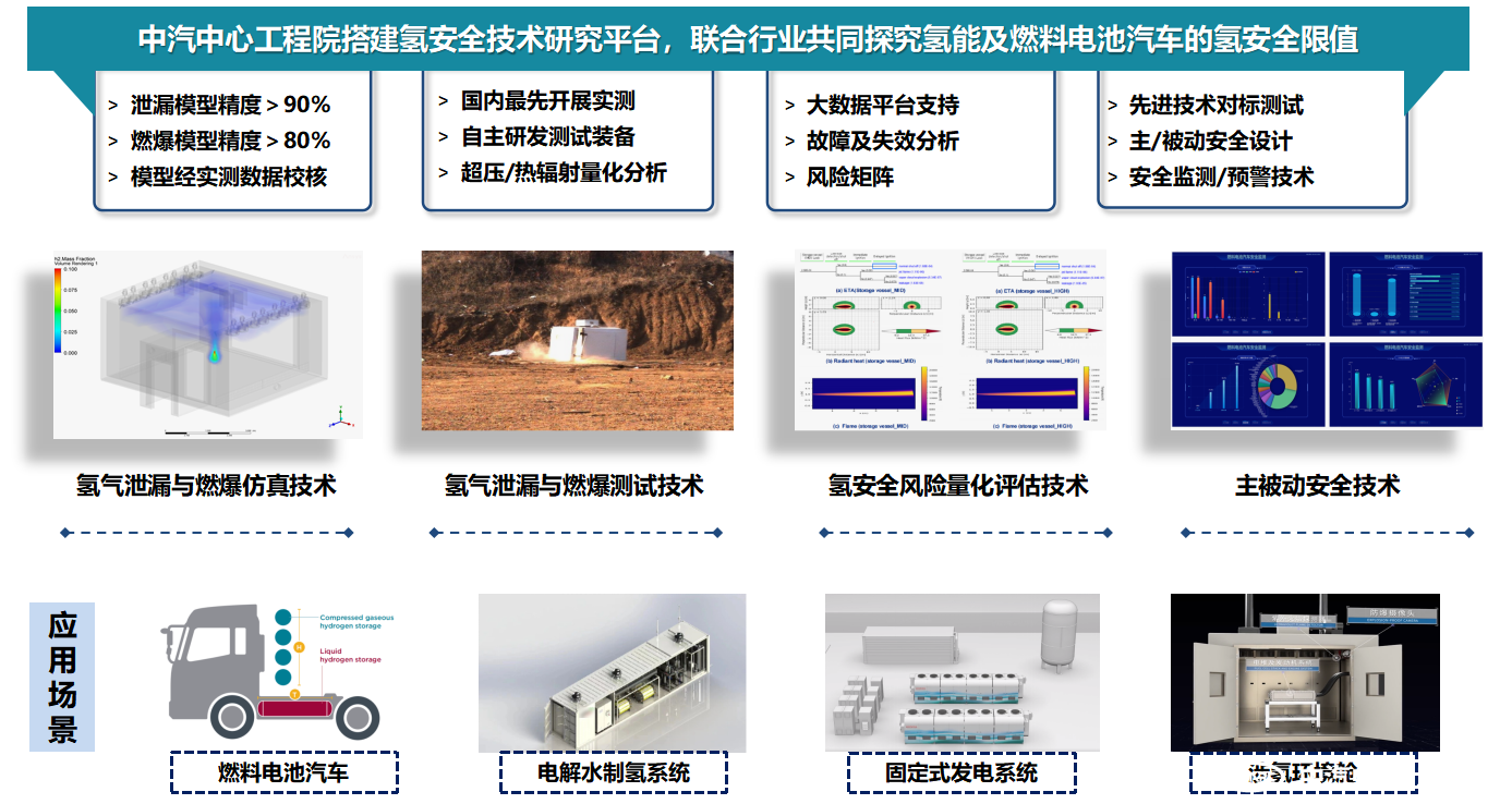 中汽中心工程院在汽車安全領域已有十余年技術積淀,服務于氫能產業應用發展,我們致力于搭建氫安全技術研究平臺,開展對氫氣泄漏與燃爆的測試與仿真技術研究,構建符合氫能及燃料電池汽車應用場景的氫安全風險量化評估體系。