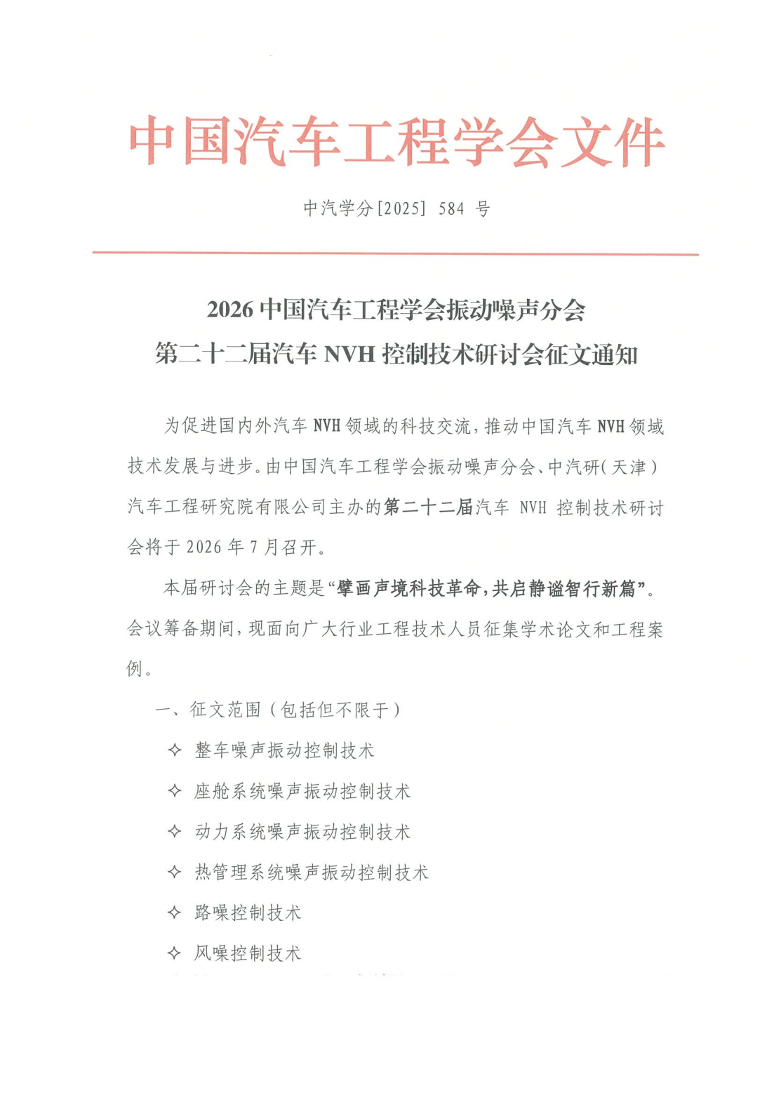 2026中國汽車工程學會振動噪聲分會 第二十二屆汽車NVH控制技術研討會征文啟事