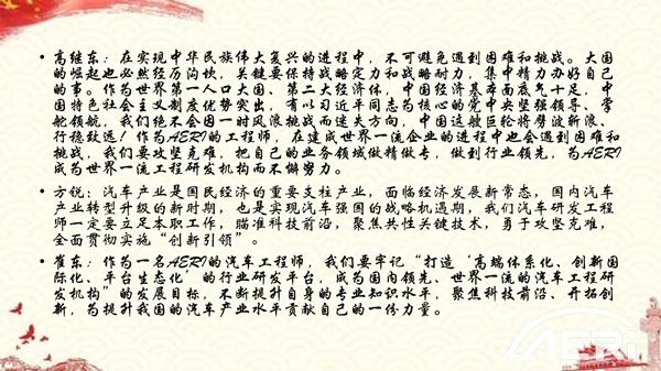 本次學習卓有成效地統一了全體黨員的思想戰線,進一步樹牢 “四個意識”,堅定“四個自信”,堅持“兩個維護”,大大提高了支部的凝聚力與戰斗力。未來,第一開發部黨支部將繼續秉承璦睿人“激情、責任、感恩、奮進”的文化理念,堅持“開放、變革、創新”的發展理念,為將工程院打造成國內領先、世界一流的汽車工程研發機構而不懈努力,為我國的汽車工業貢獻力量!(石夢妍)