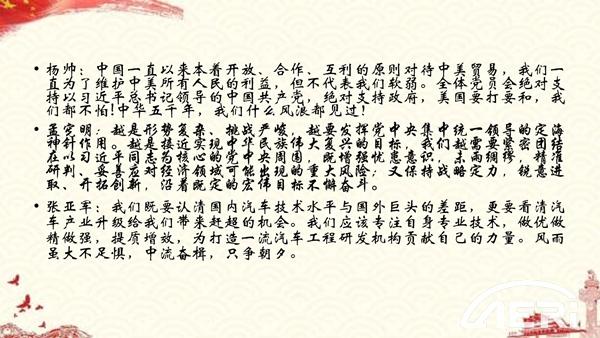 支部黨員結合自己的工作實際,圍繞國家命運、黨員責任、職業追求分享學習感想。高繼東同志表示,在實現中華民族偉大復興的進程中,不可避免遇到困難和挑戰。在以習近平同志為核心的黨中央堅強領導、掌舵領航,我們絕不會因一時風浪挑戰而迷失方向,中國這艘巨輪將劈波斬浪、行穩致遠!作為工程院的工程師,在建成世界一流企業的進程中也會遇到困難和挑戰,我們要攻堅克難,把自己的業務領域做精做專,做到行業領先,為工程院成為世界一流工程研發機構而不懈努力。支部書記方銳指出,汽車產業是國民經濟的重要支柱產業,面臨經濟發展新常態,國內汽車產業轉型升級的新時期,也是實現汽車強國的戰略機遇期,我們汽車研發工程師一定要立足本職工作,瞄準科技前沿,聚焦共性關鍵技術,勇于攻堅克難,全面貫徹實施創新引領。