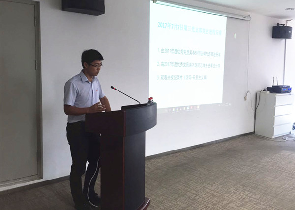 2017年7月7日上午10:00在中汽中心主樓七樓715會議室,由汽車工程研究院黨總支第三黨支部書記馬杰同志主持,2017年度優秀黨員吳春玲同志和端木瓊同志分別向第三黨支部24名參會黨員作了先進事跡分享。