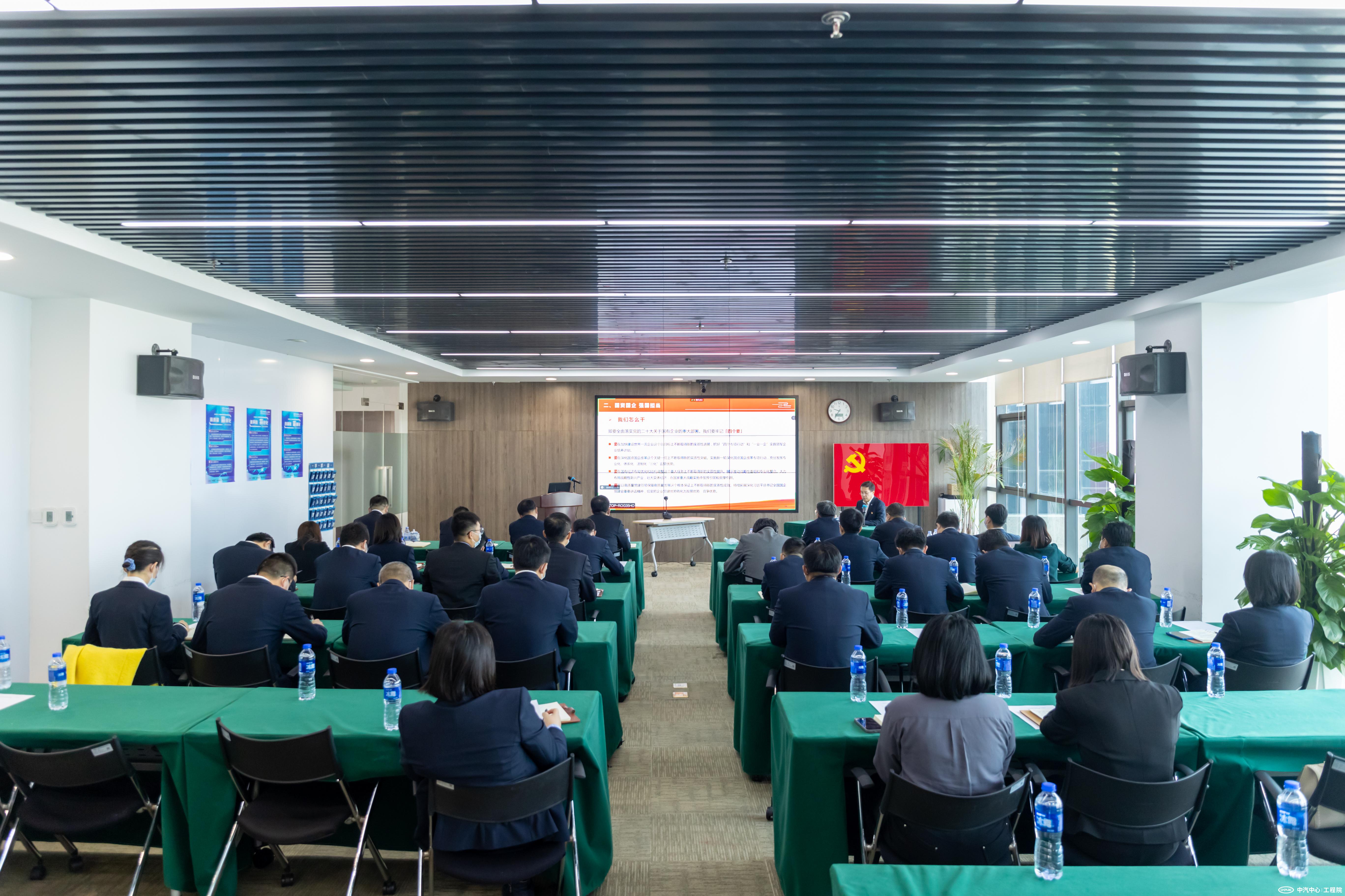 2022年11月25日上午,中汽中心黨委委員、副總經理李洧到聯系基層黨組織,為工程院黨委全體黨員干部職工講授學習貫徹黨的二十大精神專題黨課,并對黨建工作開展情況進行專題調研。工程院領導班子成員、黨員領導干部現場參加會議,其余干部職工線上參加。