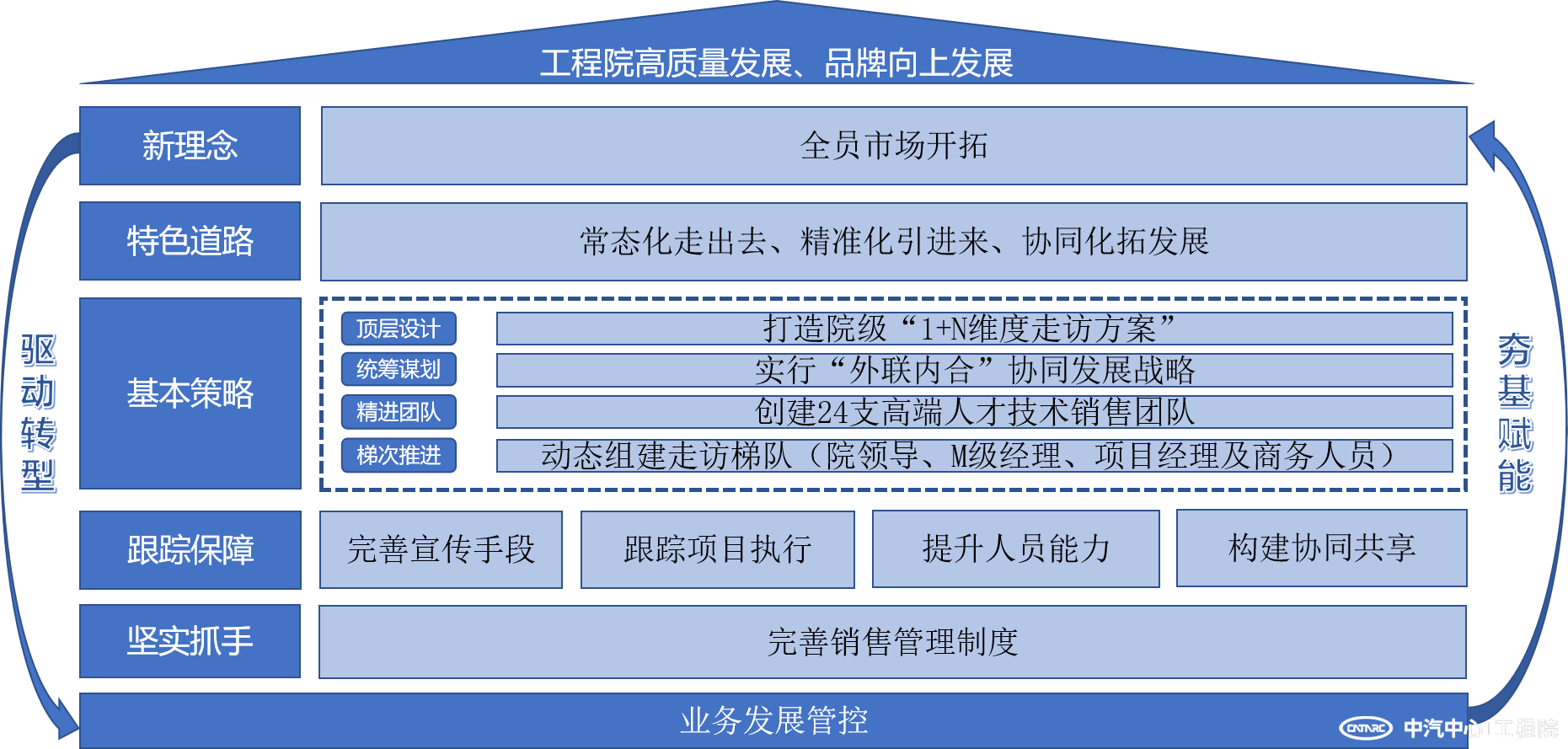 先鋒隊(duì)以實(shí)現(xiàn)“高質(zhì)量發(fā)展、品牌向上發(fā)展”為根本目標(biāo),確立了“全員市場(chǎng)開拓”的全新理念,探索出“常態(tài)化走出去、精準(zhǔn)化引進(jìn)來、協(xié)同化拓發(fā)展”的特色道路,確立了“頂層設(shè)計(jì)、統(tǒng)籌謀劃、精進(jìn)團(tuán)隊(duì)、梯次推進(jìn)”四大類基本策略,完善了“提升宣傳手段、跟蹤項(xiàng)目執(zhí)行、提高人員能力、構(gòu)建協(xié)同共享”的跟蹤保障機(jī)制,并以《銷售管理制度》為堅(jiān)實(shí)抓手,明確管理職責(zé)、提高協(xié)同效率,指導(dǎo)各項(xiàng)環(huán)節(jié)落地,構(gòu)筑起了市場(chǎng)開拓的整體布局。